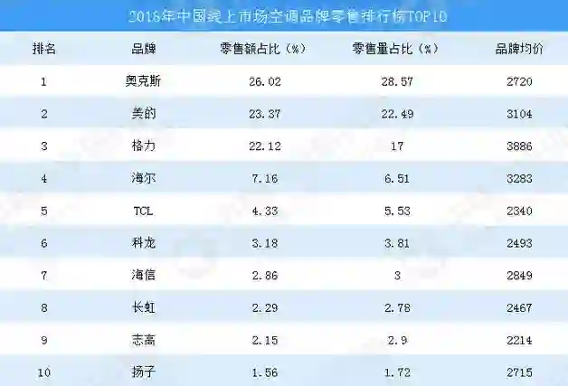 2018年的京东双11促销中,奥克斯力压美的、格力位居首位。而在2018年线上空调销售排行榜上,奥克斯同样位居第一,均价相比格力低三成左右。