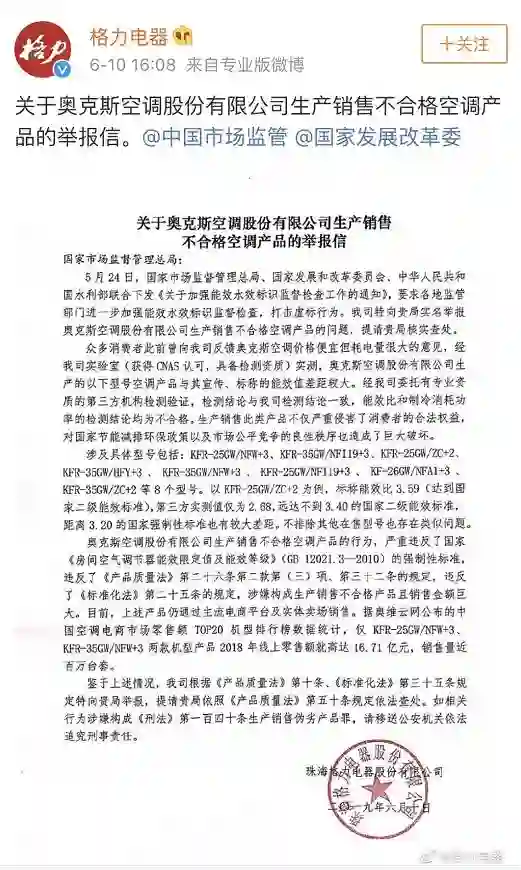 6月10日,格力电器在官方微博上发布《关于奥克斯空调股份有限公司生产销售不合格空调产品的举报信》并@中国市场监管及国家发展改革委 。