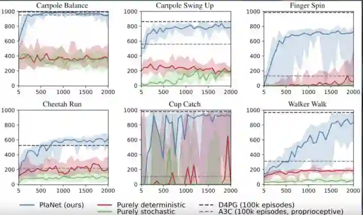从论文中可以看出:PlaNet在所有任务上明显优于A3C,并且达到接近D4PG的最终性能,同时与环境的交互平均减少5000%。