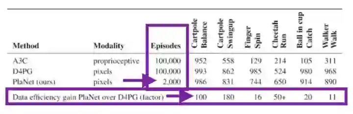 来自论文:“PlaNet解决了各种基于图像的控制任务,在性能方面与先进的无代理模型比较,平均效率提高了5000%······这些学习动态可以独立于任何特定任务,因此有可能很好地迁移到环境中的其他任务。”