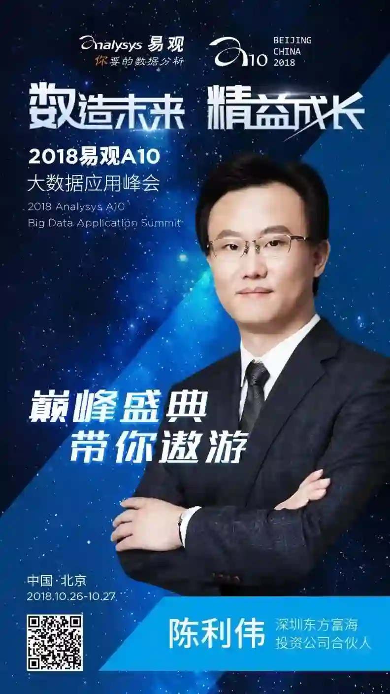 2018年10月26-27日,易观A10大数据应用峰会将于北京召开,东方富海合伙人陈利伟将出席峰会现场,为我们全面解析大数据下企业的商业机遇。