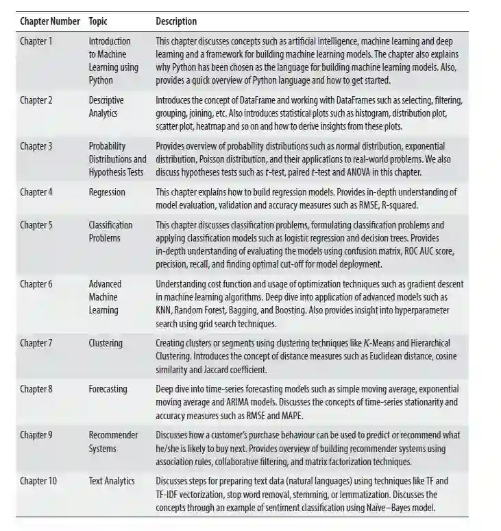 本书通过提供真实的案例研究和示例,为使用Python库进行机器学习提供了坚实的基础。它涵盖了诸如机器学习基础、Python入门、描述性分析和预测分析等主题。包括高级机器学习概念,如决策树学习、随机森林、增强、推荐系统和文本分析。这本书在理论理解和实际应用之间采取了一种平衡的方法。所有的主题都包括真实世界的例子,并提供如何探索、构建、评估和优化机器学习模型的逐步方法。