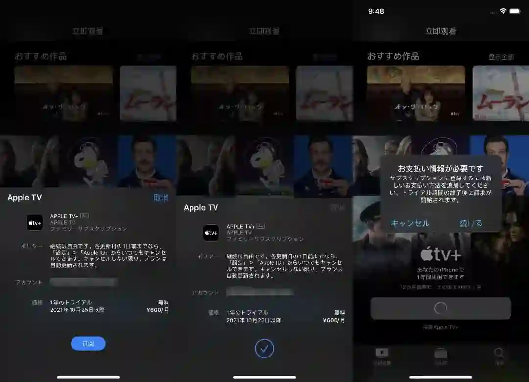 该账号已绑定地区限定的支付方式(例如美区绑定 PayPal 或日区绑定 JCB 信用卡),或帐户余额足够支付一个月的 Apple TV+ 订阅费用(美区每月 4.99 美元,日区每月 600 日元),就能顺利确认支付。如果没有符合要求的支付方式,则不能领取。