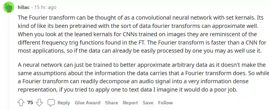 网友 @hillac 认为,傅里叶变换被认为是具有集合核的卷积神经网络(CNN)。经过数据预训练的傅里叶变换可以实现很好地逼近。当你观察图像上训练的 CNN 的倾斜内核时,它们会让人联想到傅里叶变换中发现的不同频率的触发函数。对于大多数应用来说,傅里叶变换的速度比 CNN 快,所以,如果数据易于处理,则可以使用傅里叶变换。