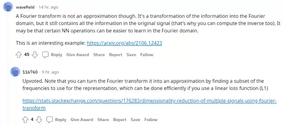 另一位网友 @wavefield 表示,傅里叶变换不近似值。它是信息到傅里叶域的转换,仍然包含原始信号中的所有信息,这也是为何能够逆计算的原因。应该看到,某些神经网络运算更容易在傅里叶域中学习。