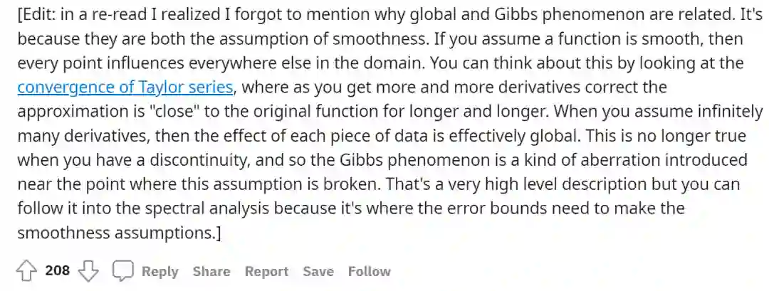补充一点关于吉布斯现象。如果假设一个函数是平滑的,那么每个点都会影响域中的其他任何地方。你可以通过查看泰勒级数的收敛性来考虑这一点,随着获得越来越多的导数正确,近似值越来越接近原始函数。当假设无限多的导数时,每条数据的影响实际上是全局的。当你有一个不连续性时,这不再是正确的,所以吉布斯现象是一种在这个假设被打破的点附近引入的畸变。这是一个非常高级的描述,但你可以将其引入光谱分析,因为它是误差界限需要做出平滑假设的地方。