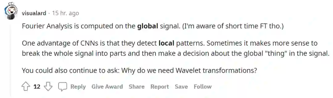 傅里叶分析是在全局信号上计算的,而 CNN 的一个优点是它们可以检测局部模式。有时将整个信号分解为多个部分,然后再对信号中的全局「thing」做出决策会更有意义。