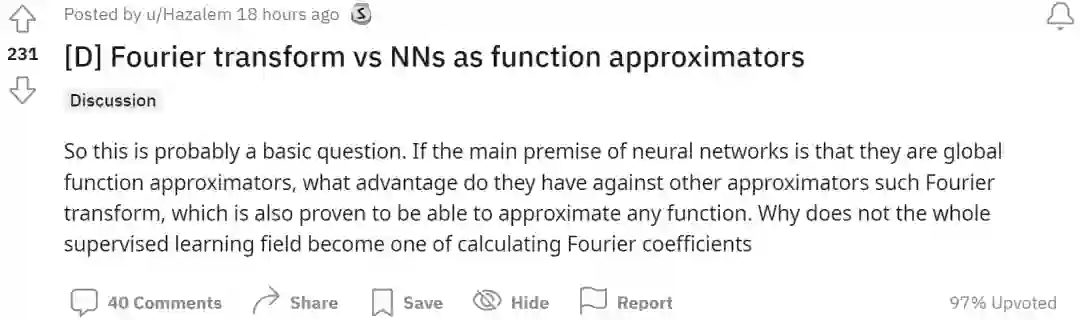 发帖者认为,这是一个基础性问题。ta 提出了疑问,「如果神经网络的主要前提是全局函数逼近器,那么与傅里叶变换等其它也被证明能逼近任何函数的逼近器相比有哪些优势?为什么整个监督学习没有变成计算傅里叶系数的领域之一?」