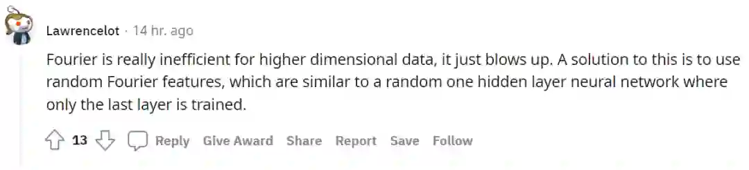 有人更是指出,傅里叶变换对高维数据效率非常低下。对此,使用随机傅里叶特征是一种解决方案,它类似于仅训练最后一层的随机单隐藏层神经网络。