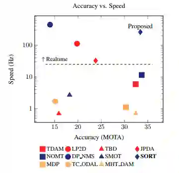 多目标跟踪被视为数据关联问题,在视频帧序列中进行跨检测结果的关联,为了解决数据相关的问题,跟踪器使用了多种方法对运动过程和运动目标的外观特征进行建模!但作者发现这些算法并不能在精度和速度之间达到一个tade-off,如下图: