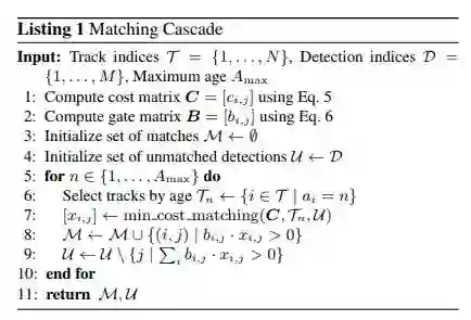 轨迹处理:这个主要说轨迹什么时候终止、什么时候产生新的轨迹。首先对于每条轨迹都有一个阈值a用于记录轨迹从上一次成功匹配到当前时刻的时间。当该值大于提前设定的阈值 则认为改轨迹终止,直观上说就是长时间匹配不上的轨迹认为已经结束。然后在匹配时,对于没有匹配成功的检测都认为可能产生新的轨迹。但由于这些检测结果可能是一些错误警告,所以对这种情形新生成的轨迹标注状态'tentative' ,然后观查在接下来的连续若干帧(论文中是3帧)中是否连续匹配成功,是的话则认为是新轨迹产生,标注为'confirmed',否则则认为是假性轨迹,状态标注为'deleted'