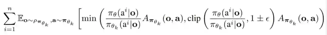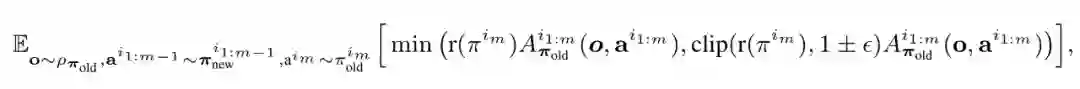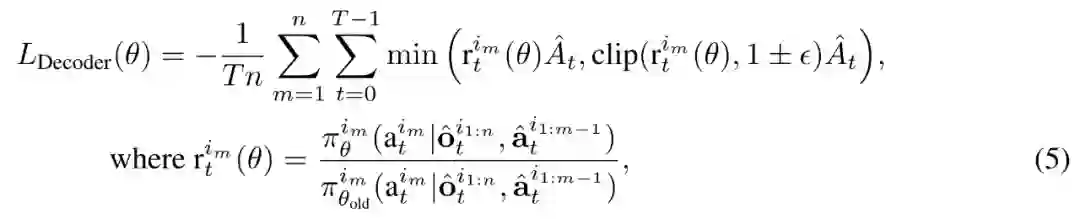 解码器的参数用θ表示,它将嵌入的联合动作 a^i_0:m−1 , m = {1, . . . n}(其中 a^i_0 是指示解码开始的任意符号)传递到解码块序列。至关重要的是,每个解码块都有一个掩码的自注意力机制。为了训练解码器,研究者将如下裁剪 PPO 目标最小化。