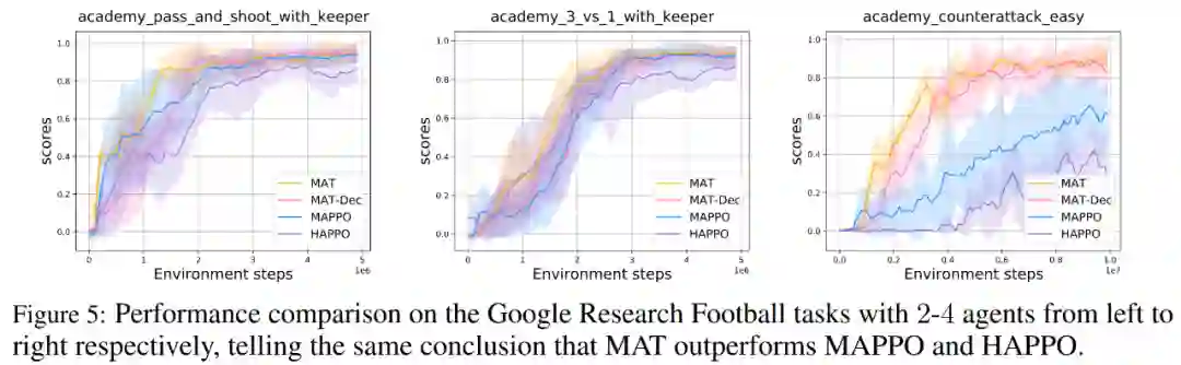此外,研究者还在 Bimanual Dxterous Hand Manipulation (Bi-DexHands)和 Google Research Football 基准上了对 MAT 进行了扩展测试。前者提供了一系列具有挑战性的双手操作任务,后者提供了一系列足球游戏中的合作场景。
