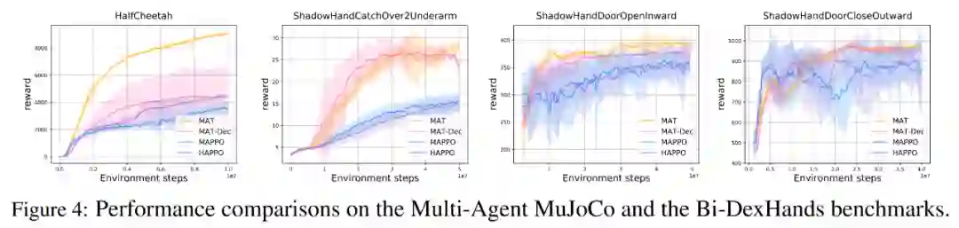 如下表 1 和图 4 所示,对于 SMAC、多智能体 MuJoCo 和 Bi-DexHands 基准来说,MAT 在几乎所有任务上都显著优于 MAPPO 和 HAPPO,表明它在同构和异构智能体任务上强大的构建能力。此外,MAT 还得到了优于 MAT-Dec 的性能,表明了 MAT 设计中解码器架构的重要性。