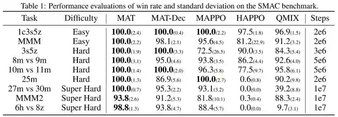 本文的目标是在 MARL 和 SM 之间建立桥梁,以便为 MARL 释放现代序列模型的建模能力。MAT 的核心是编码器 - 解码器架构,它利用多智能体优势分解定理,将联合策略搜索问题转化为序列决策过程,这样多智能体问题就会表现出线性时间复杂度,最重要的是,这样做可以保证 MAT 单调性能提升。与 Decision Transformer 等先前技术需要预先收集的离线数据不同,MAT 以在线策略方式通过来自环境的在线试验和错误进行训练。