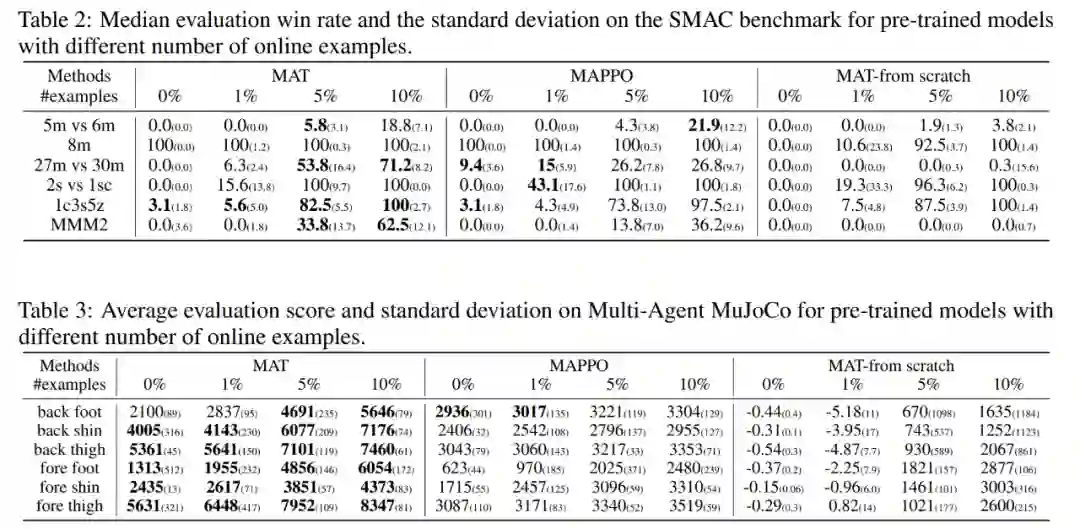 最后,由于 Transformer 模型通常在小样本任务上表现出强大的泛化性能,因此研究者相信 MAT 在未见过的 MARL 任务上也能具有类似强大的泛化能力。因此,他们在 SMAC 和多智能体 MuJoCo 任务上设计了零样本和小样本实验。