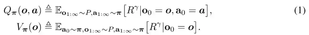 智能体通过 Q_π(o, a)和 V_π(o)来评估行动和观察的值,定义如下。