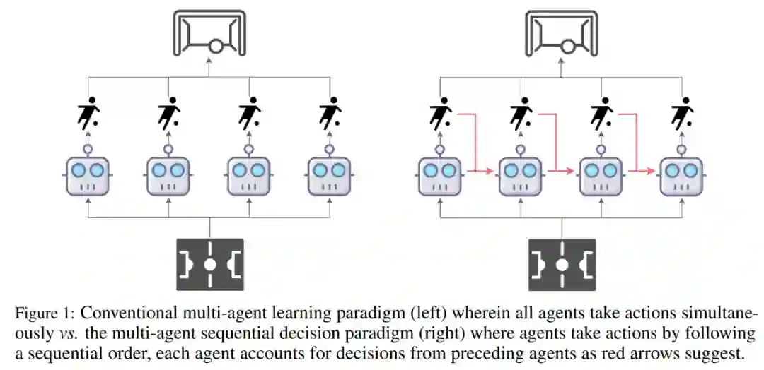传统多智能体学习范式(左)和多智能体序列决策范式(右)的对比。