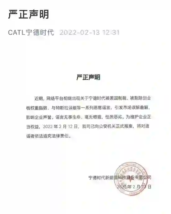 宁德时代发布声明:近期,网络平台相继出现关于宁德时代被美国制裁、被剔除创业板权重指数、与特斯拉谈崩等一系列恶意谣言,我司已向公安机关正式报案。特斯拉有关负责人13日回应称,“和特斯拉谈崩,确实不属实。”(中证报)