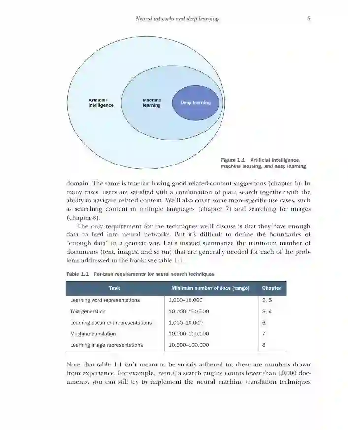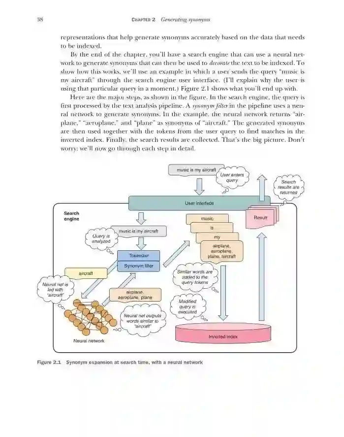 第1部分介绍了搜索、机器学习和深度学习的基本概念。第一章介绍了应用深度学习技术来搜索问题的原理,涉及了信息检索中最常见的方法。第2章给出了如何使用神经网络模型从数据中生成同义词来提高搜索引擎效率的第一个例子。