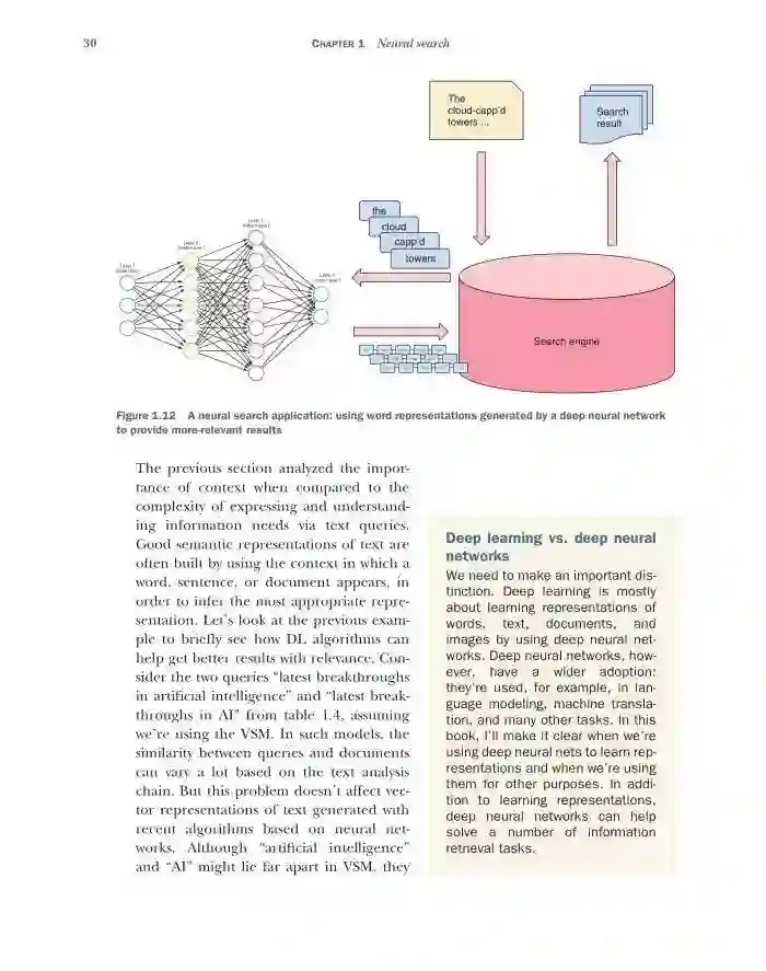 【导读】深度学习搜索是一本实用的书,关于如何使用(深度)神经网络来帮助建立有效的搜索引擎。这本书研究了一个搜索引擎的几个组成部分,提供了关于它们如何工作的见解,以及如何在每个环境中使用神经网络的指导。重点介绍了基于实例的实用搜索和深度学习技术,其中大部分都有代码。同时,在适当的地方提供相关研究论文的参考资料,以鼓励阅读更多的书籍,加深对特定主题的知识的理解。读完这本书,将对搜索引擎的主要挑战有所理解,它们是如何处理的以及深度学习可以做些什么来提供帮助。并且将对几种不同的深度学习技术以及它们在搜索环境中的适用范围有所理解,将很好地了解Lucene和Deeplearning4j库。
