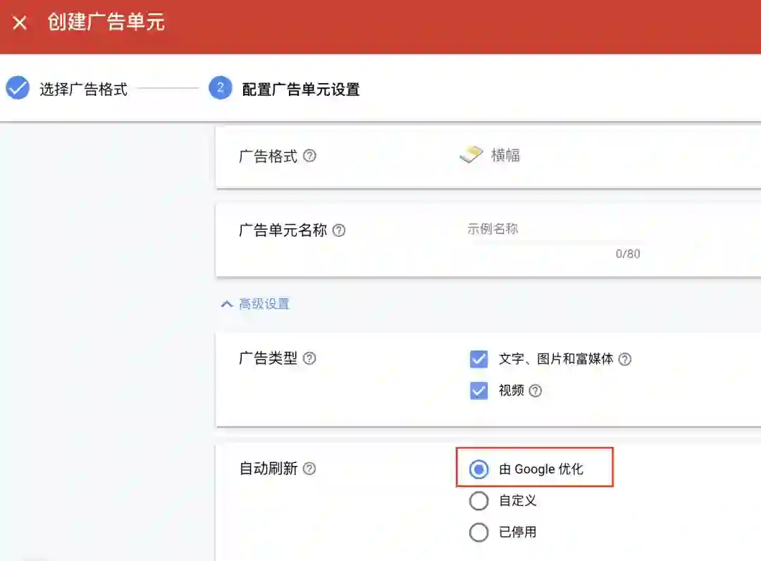 在 AdMob 横幅广告单元设置中的高级设置里选择自动刷新 - “由 Google 优化”,让 AdMob 帮助优化横幅刷新,产生更好的横幅收入。