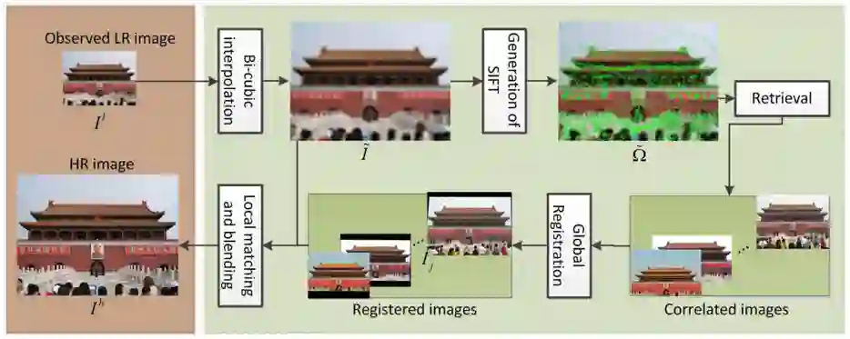 Landmark 模型 [14] 通过图像检索技术,从网络上爬取与输入图像相似的高分辨率图像,再进一步通过图像配准操作,最终合成得到对应的超分辨率结果,其算法流程如图8所示。