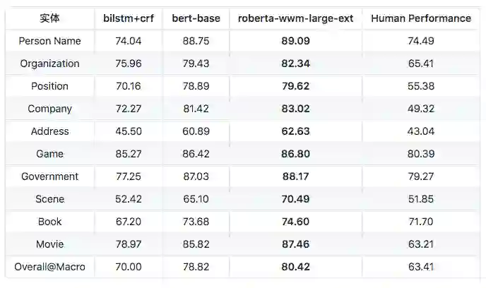 各个实体的评测结果(F1 score):