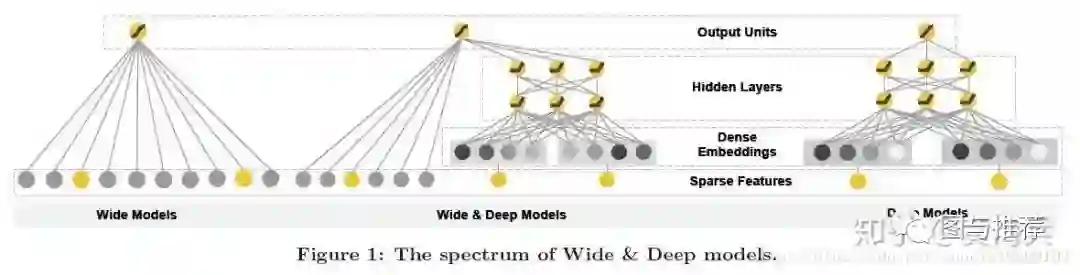 Wide&Deep:模型包括两个部分,分别为Wide部分和Deep部分,Wide部分如图1的左图所示,Deep部分如下图中的右图所示。Wide模型就是一个广义线性模型,Wide模型是前馈神经网络。两种模型进行联合训练,将两个模型的结果加权求和作为最终的预测结果。