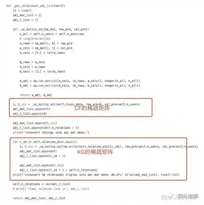 get_lational_adj_list:用稀疏矩阵变量adj_*mat_*list存储CF与KG的连通信息。
