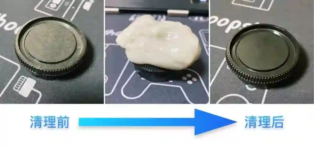 AM 清洁胶在清理灰尘时,可以说是既方便又高效,对于那些覆盖在表面的灰尘,只要用清洁胶往上一按即可尽数吸走。因为胶体本身具有延展性,即使是键盘缝、杯盖的凹陷处都可以处理。但对于一些特别细小的缝隙或转角,AM 清洁胶还是会有些力不从心。