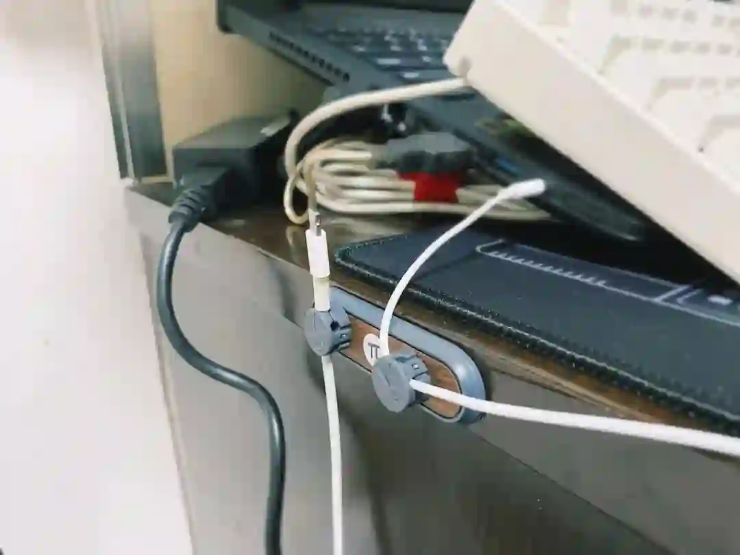 首先,我在桌面边缘贴了一个磁吸式的线材收纳器。将卡扣固定在手机数据线、耳机线上以后,就可以把它们吸附在收纳器上了。收纳器后端粘得非常牢固,即使你使劲拽也不会松脱。