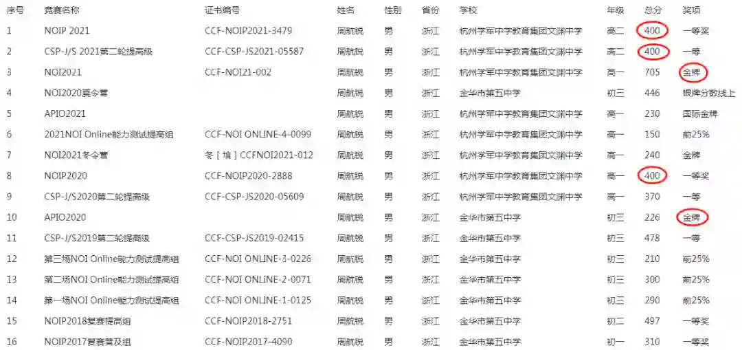 2018年,初二的周航锐报名了NOIP提高组,获得一等奖,并进入浙江省前100名。