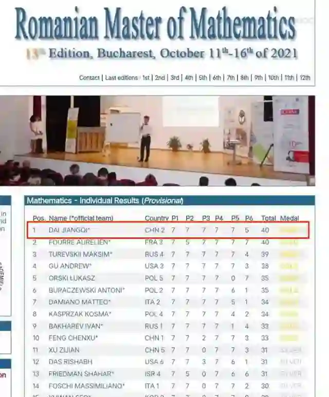 在2021年10月举办的第13届罗马尼亚数学奥林匹克大师赛,戴江齐力克多名外国选手,夺得这项被誉为