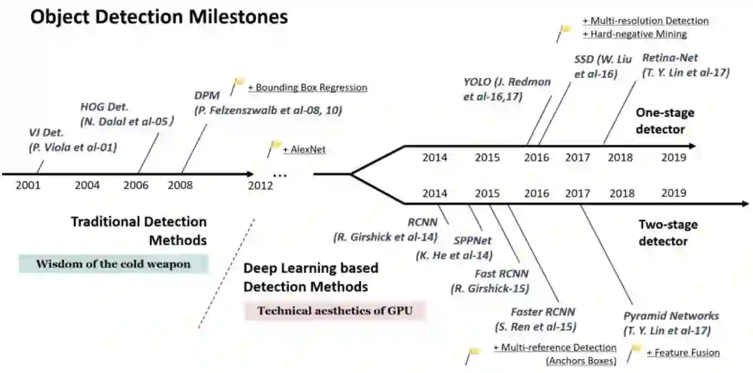我们将从多个方面回顾对象检测的历史,包括里程碑检测器、目标检测数据集、指标和关键技术的发展。在过去的二十年中,人们普遍认为,目标检测的发展大致经历了两个历史时期:“ 传统的目标检测时期 ” ( 2014年以前 ) 和 “ 基于深度学习的检测时期 ” ( 2014年以后 ),如下图所示。