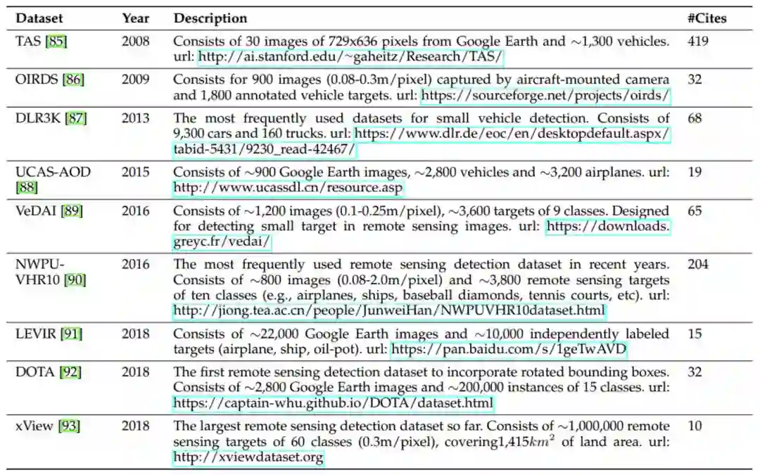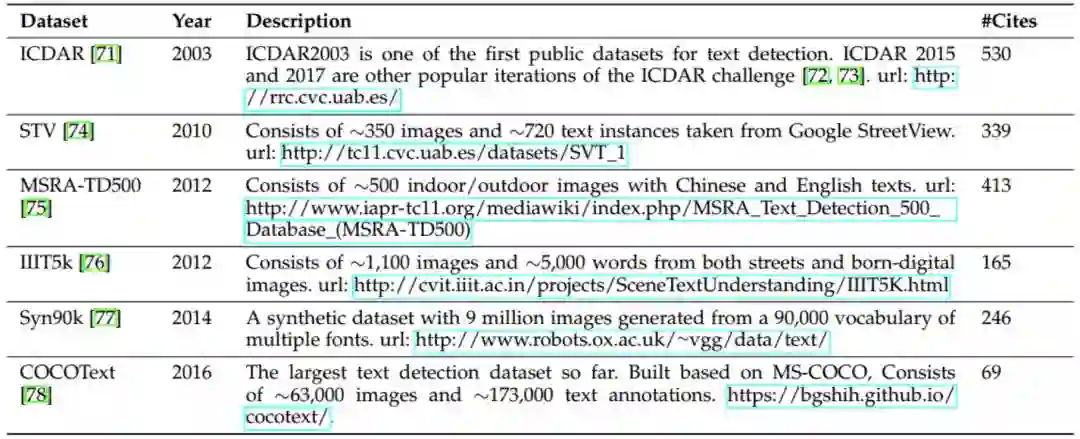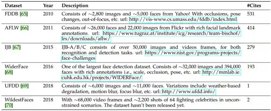 在过去的20年里,除了一般的目标检测外,在行人检测、人脸检测、文本检测、交通标志/灯光检测、遥感目标检测等特定领域的检测应用也十分繁荣。下面一系列表列出了这些检测任务的一些流行数据集。有关这些任务的检测方法的详细介绍可在后期分享中找到。