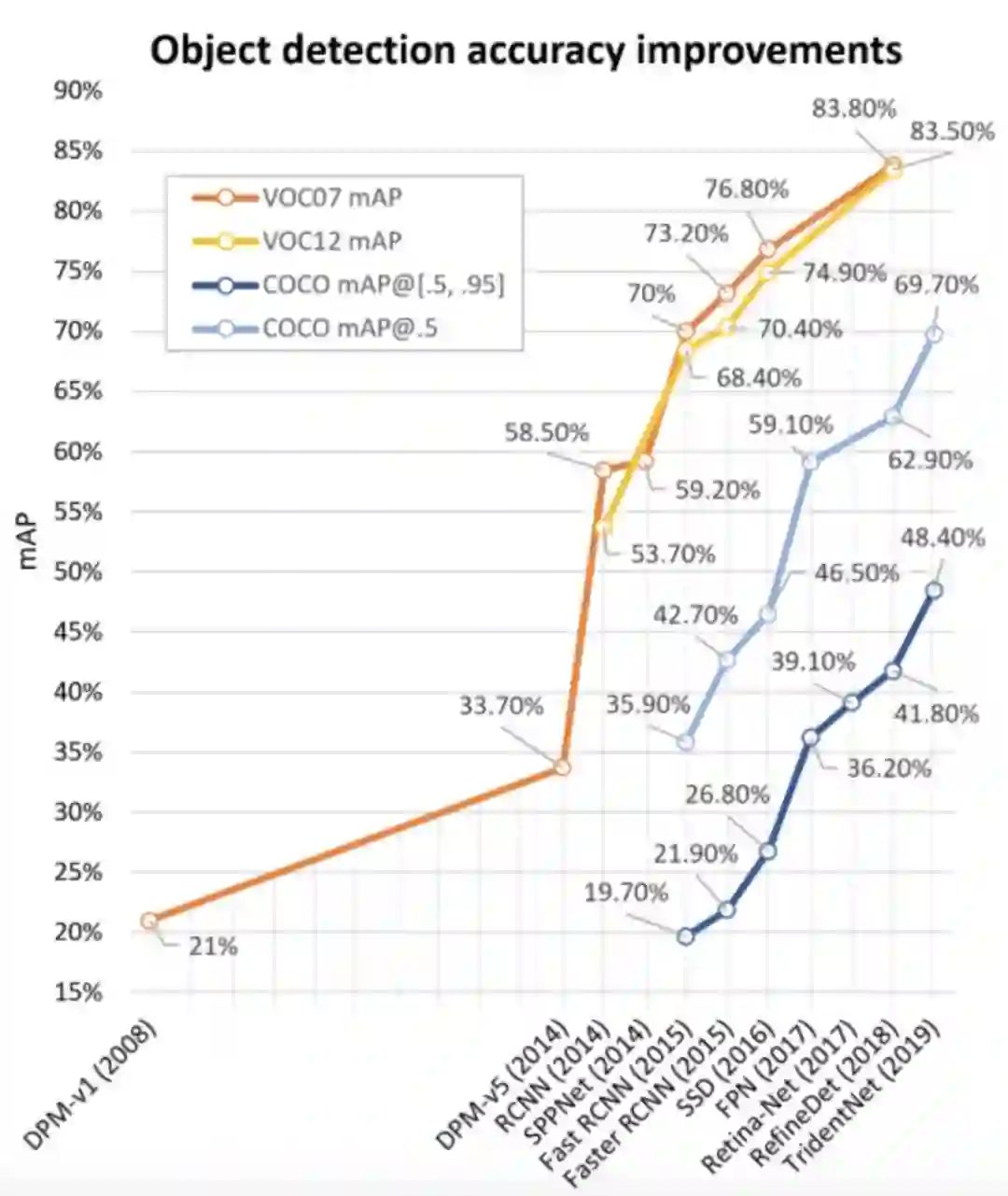 下图显示了从2008年到2018年对VOC07、VOC12和MS-COCO数据集检测精度的提高。
