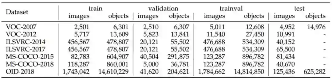 建立具有更少的偏置的更大的数据集,是开发先进的计算机视觉算法的关键。在目标检测方面,在过去10年中,已经发布了许多著名的数据集和基准测试,包括PASCAL VOC挑战的数据集(例如,VOC2007, VOC2012)、ImageNet大尺度视觉识别挑战(例如,ILSVRC2014)、MS-COCO检测挑战等。下表1给出了这些数据集的统计数据。