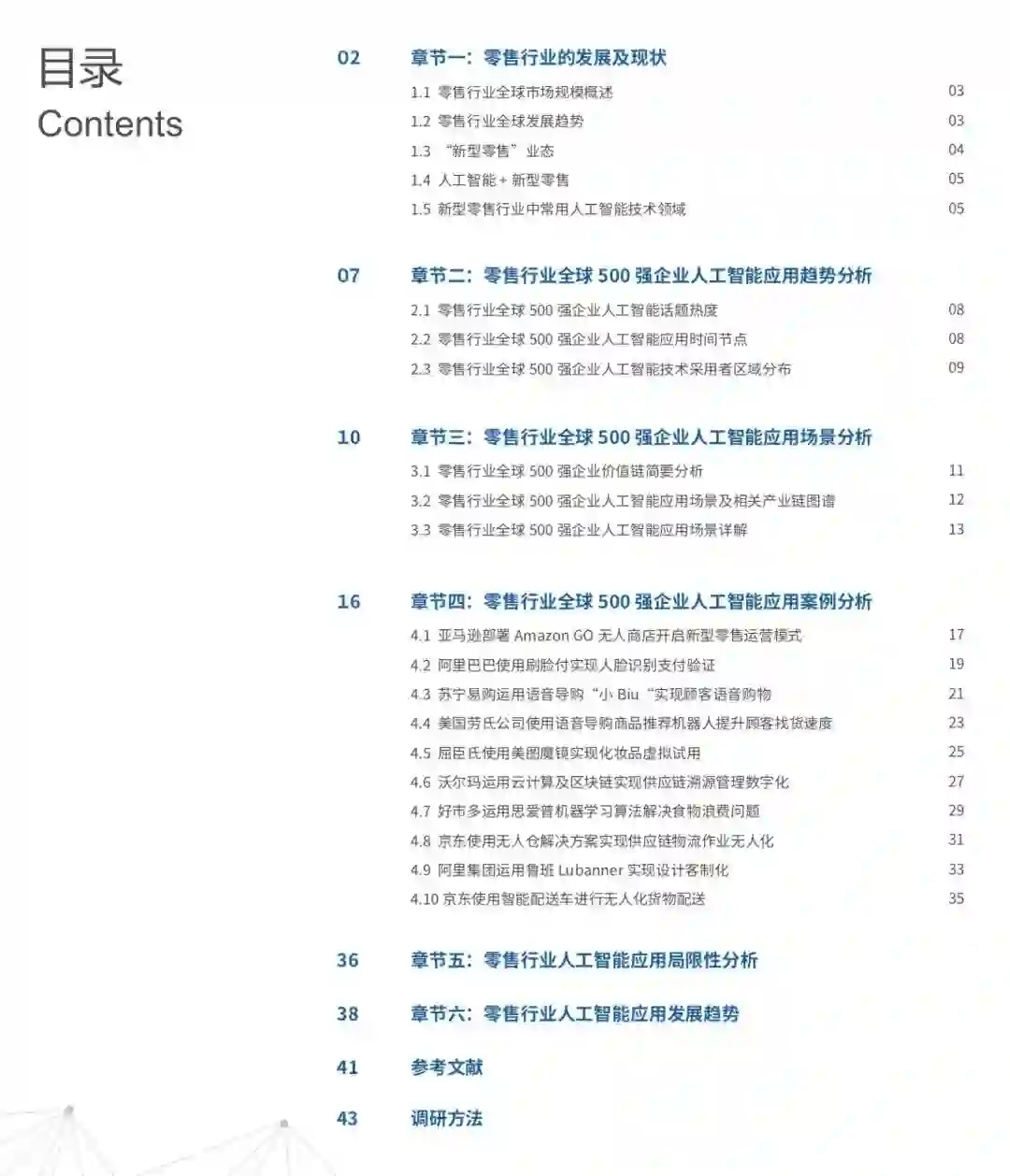 在此背景下,机器之心产业研究团队推出了《当新型零售遇上人工智能——AI+零售行业研究报告》。报告基于「人、货、场」的概念将新型零售行业划分为消费场景、经营运营和供应链三大场景,并归纳 10 大人工智能应用场景,更囊阔多家零售行业全球 500 强企业案例,从技术与落地层面详细剖析各企业人工智能领域应用。报告目录如下: