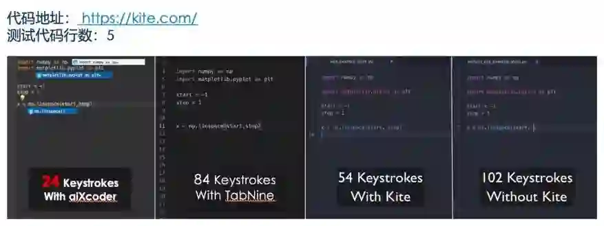 在对比过程中,aiXcoder 会使用 Kite 或 TabNine 官方提供的示例代码,并测试完成这段代码到底需要多少次按键。结果表明,aiXcoder 较其他插件在效率上提升 1.5 倍以上。