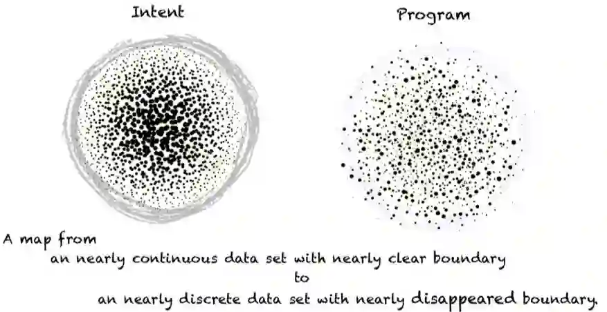 但是在代码生成方面,从编程者的意图(intent)生成程序代码的问题,可以看做是「程序员意图空间」到「程序代码空间」的映射,其中意图可以是由自然语言描述的信息。 如上图所示,这是从一个较为连续的、有着较清晰边界的数据集,向一个更加离散而没有清晰边界的数据集进行映射。
