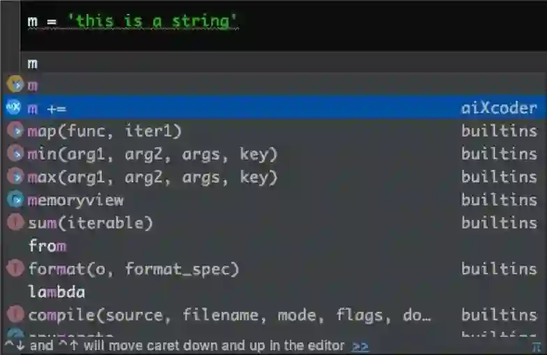 对于一些变量,aiXcoder 可根据变量类型提出该变量可能的操作,比如,对于下图的变量「m」,aiXcoder 提出了一个对字符串进行增加的代码: