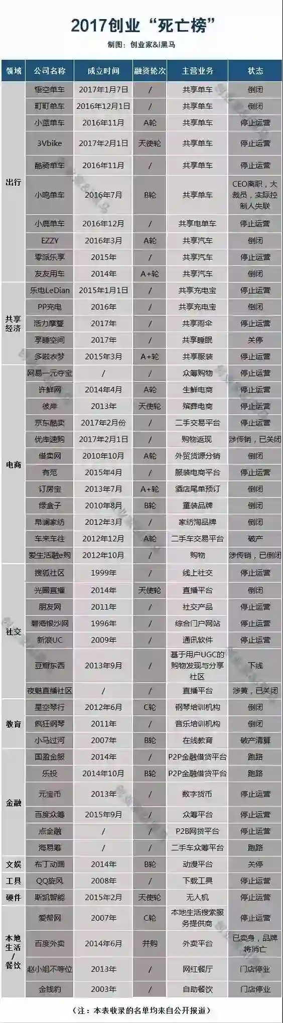 2017年即将结束,创业家&i黑马盘点了这一年中未能活下来的创业项目,历来称作“创业死亡榜”。其中,你能看到的项目的创始人,在启动之时大多饱含热忱,死亡来临前一刻也曾奋力争取生机。