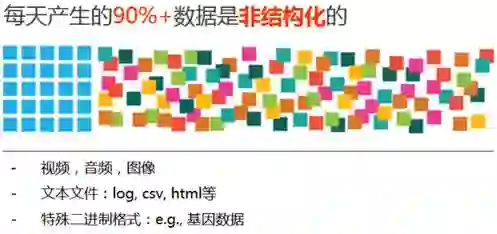 Variety (数据类型):包括结构化和非结构化的数据,特别是最近随音视图兴起,非结构化数据增速更快。