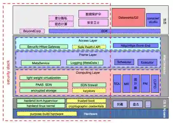 系统安全:系统安全方面,MaxCompute 通过综合运用计算虚拟化和网络虚拟化技术,为云上多租户各自的用户自定义代码逻辑提供了安全而且完善的计算和网络隔离环境。