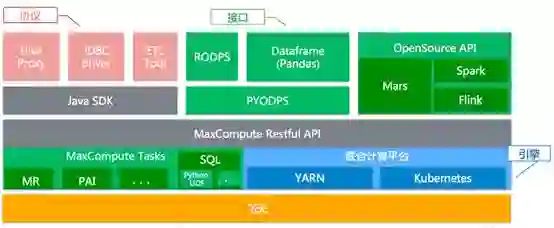 “不是单一的引擎”体现在,MaxCompute 原生支持 SQL、MR、DAG 编程语义和Graph、PAI 机器学习计算,同时也通过联合计算平台支持任意第三方引擎,如Spark、Flink等 。