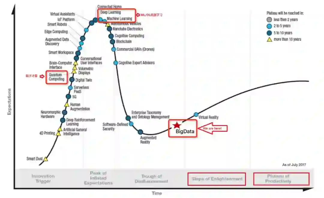 同时,与其他老牌系统相比(如,Linux 等操作系统体系,数据库系统、中间件,很多有超过30年的历史),大数据系统又非常年轻,随着云计算的普惠,正在大规模被应用。海量的需求和迭代推动系统快速发展,有蓬勃的生机。(技术体系的发展,可以通过如下 Hype-Cycle 概述,作者认为,大数据系统的发展进入技术复兴期/Slope of Enlightenment,并开始大规模应用 Plateau of Productivity。)
