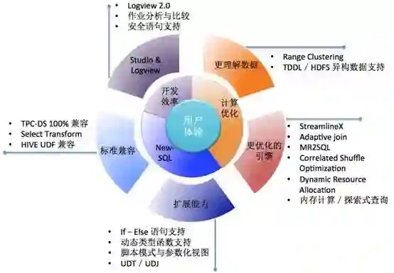 MaxComputeSQL 引擎当前的发展,以提升用户体验为核心目标,在 SQL 语言能力、引擎优化等多个方向上兼顾发力,建立技术优势,在 SQL 语言能力方面, 新一代大数据语言 NewSQL 做到了 Declarative 语言和 Imperative 语言的融合,进一步提升语言兼容性,目前已100% 支持 TPC-DS 语法。过去一年中,MaxCompute 新增了对 GroupingSets,If-Else 分支语句,动态类型函数,等方面的支持。