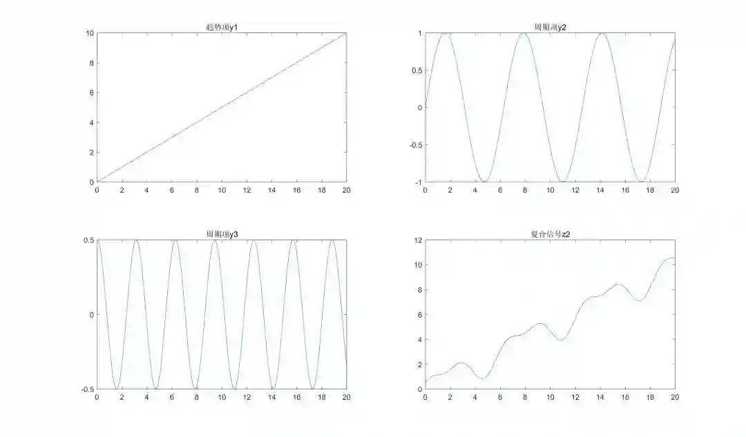 在 1)的情况下增加周期项y3=cos(2*x),即复合信号z2=z1+y3,如下图所示: