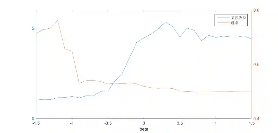 基于IF0000合约20110101至20161231期间的历史数据,我们测试了beta自-1.5至1.5间隔的策略效果。如下图所示,左轴表示策略的累积收益(在不考虑止损和交易费用的情况下)、右轴表示策略的胜率。从测试的结果来看,随着beta的增大,收益明显增加,直到beta=0.3时达到最大值,随后递减。而胜率则随着beta的增加一路递减,并最终稳定在0.5左右。